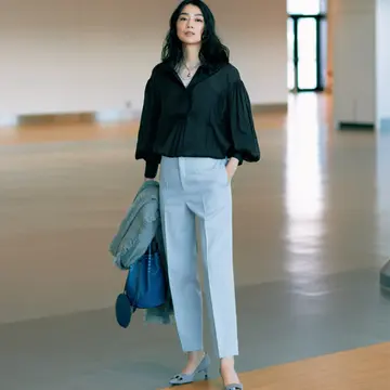 腰高に見えるきりっとしたパンツには同色系の甘めトップスで華やかさをプラス
