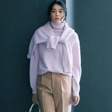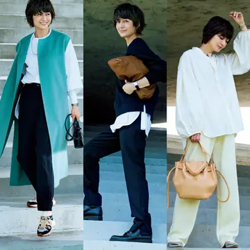 パンツ¥33,000/SANYO SHOKAI(マッキントッシュ ロンドン) ジャケット¥235,400/マディソンブルー ニット¥14,850/オンワード樫山 お客様相談室(23区) ピアス¥57,200・ブレスレット¥39,600/マリハ バッグ¥97,900/ピエール アルディ 東京(ピエール アルディ) 靴¥121,000/ジェイエムウエストン 青山店(ジェイエムウエストン)
