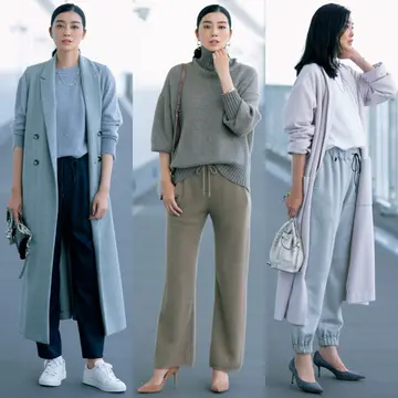 カジュアル見えするネイビーのドロストパンツとニットの組み合わせは、マキシ丈のジレを重ねることで、ボディ全体をストレートラインに整え、身長まで高く見せてくれる効果が。ジレを加えることでワンツーコーデに立体感が生まれパンツスタイルの洗練度がアップする。