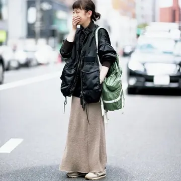 女らしいロングスカートにはカジュアルな小気味よさを、ゆるいパンツにはきれいめのニュアンスを。それが簡単に足せるのがショートアウターのよいところ。例えば、しなやかなロングスカートにはクールなレザージャケットで軽さをプラス。