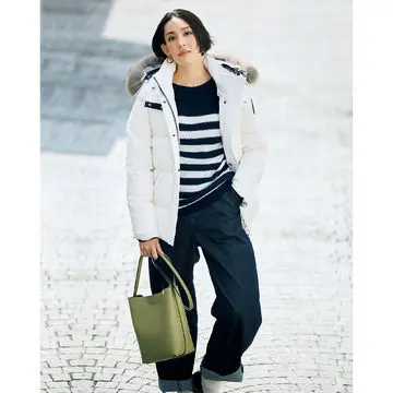’13年に発表され、またたく間にブランドを代表するアイコンとなったテディベアコート。その愛らしい素材を使ったバイカーズ型が新作として仲間入りした。「軽くて暖かくて、ちょっとスポーティな雰囲気が加わったところがいいですね」と坪田さんが絶賛する素材は、アルパカ、ウール、シルクをブレンドしてファーのように毛羽立たせたもの。ウエスト部をベルトで調整できるので、小柄さんや車移動にも最適。34~42までの5サイズ展開。
