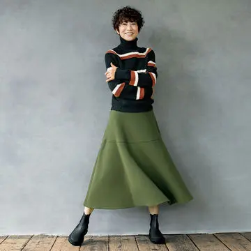 揺れるロングスカートなどボリュームボトムに合わせるなら、ニットはジャストサイズが正解。セットインスリーブだからふんわりしつつも上半身をキュッと見せてくれる。