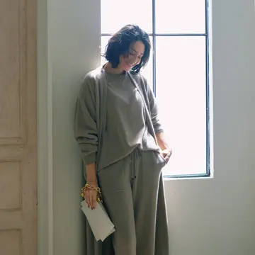 あえてリブの幅を変えたカーディガンとスカートのセットアップは、フラットな印象になりがちな上下の組み合わせに、メリハリを加えてスタイルよく見せてくれる。パープルがかった品格のあるグレーが女らしさも盛り上げる。