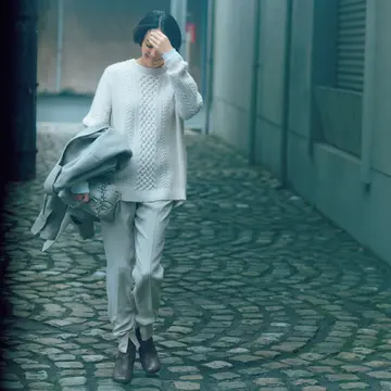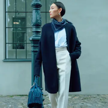 パンツ¥28,600/エディション 表参道ヒルズ店(エディション) ジレ(共布ベルトつき)¥77,000/ザ ストア バイシー 代官山店(ロエフ) タートルネックニット¥25,300/e bure GINZA SIX店(ebure) 肩に巻いたニット¥37,400/イレーヴ ピアス¥23,100/ショールーム セッション(マリハ) ブレスレット¥47,300/エスケーパーズオンライン(ソ フィー ブハイ) バッグ¥121,000/カオス丸の内(ザンケッティ) 靴¥130,900/ジミー チュウ