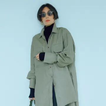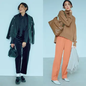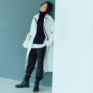今季注目の進化系テーパードパンツは、ロング丈となら抜群の縦長効果を発揮。ジョグパンツのゆるやかなシルエットがロングジレの縦ラインを強調。すっきりとしたレイヤードが実現。