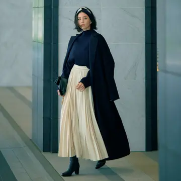 本来甘めなイメージのギャザースカートの素材に、ダークネイビーのリアルレザーを採用することで、まったく新しいスカートの表情を引き出して。ざっくり柔らかなニットとの組み合わせや、暖かみのあるウール素材のロングブーツやバッグなどを合わせることで、レザースカートのハードさをぐっと優しげに。