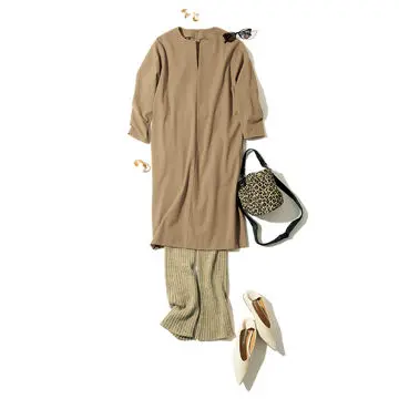 スウェット風のジョガーパンツをワンピースの下に重ねて軽やかに。柔らかなハイゲージ素材だからスニーカー合わせのスポーティな着こなしも大人の上品さをキープできるのがいい。