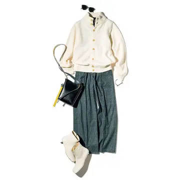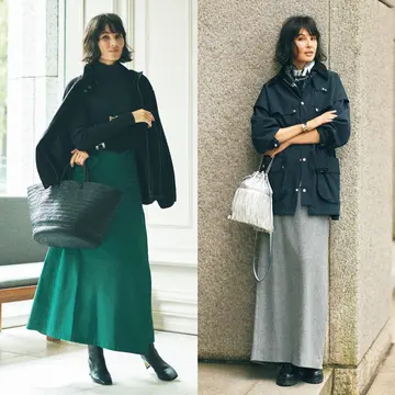 12月のおしゃれはロングスカートで“ちょっとドラマティック”に。小柄さんのバランスUPコーデに定評のあるエディター・宮崎桃代さんは、チノのボリュームロングスカートを愛用。張りのある素材ですらっと見え効果が。