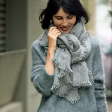 ストール(45×202)¥25,300/エレ ストリオフ ニット¥36,300/ビームス ハウス 丸の内(スローン×デミルクス ビームス) パンツ¥29,700/サードマガジン ブレスレット¥293,700/エスケーパーズオンライン(ハム) バッグ¥198,000/エリオポール代官山(ザンケッティ)