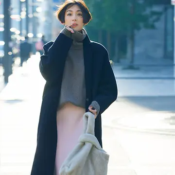 今、スタイリストやおしゃれプロがこぞって指名買いする、アメリカのアウトドアブランドのバックパック。パラシュート素材の軽さとほのかなツヤ感で、想像以上に持ちやすいのが人気の秘密。ウエストを絞って着るコートに華奢なヒールパンプス、とエレガントな装いに合わせることで、大人の余裕と遊び心がきわだつ。