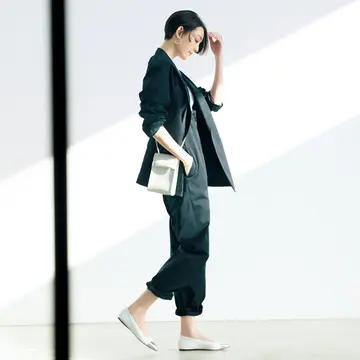 「春は、重たいコートを脱いだ開放感のままに色のおしゃれを楽しみたいから、ニュアンスカラーの靴は、色のつなぎ役として本当に重宝します。顔に近い上半身にニュートラルなベージュを集めれば、落ち着いた雰囲気にまとまりますよ」。