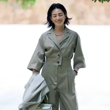 新しさも、きちんと感も、女らしさも手に入る、そんな大人のためのオールインワンスタイルを提案。ノーク バイ ザ ラインのオールインワンは、おなかからヒップまわりにゆとりがあって、こなれた雰囲気で着こなせる。