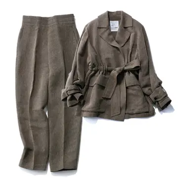リネンツイードのカフタンワンピースは、ラベンダーで染めた淡く上品な色調。サイドがボタンで大きく開くので、パンツと合わせても素敵。
