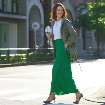 今年らしいおしゃれを取り入れたい人に、真っ先に試してほしいのがフレッシュな「きれい色」。注目のグリーンは、カジュアル感が出すぎないようオフ白と合わせて、大人らしい上質感のある着こなしに。