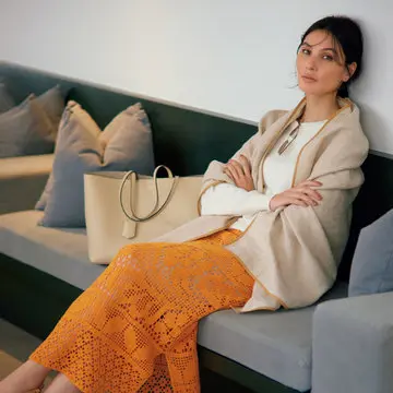 スカート¥33,000/トゥモローランド(ボールジィ) ニット¥36,300/カオス丸の内(カオス) ストール¥38,500/アイネックス(アソース メレ) バッグ¥132,000/アマン(ザネラート) 靴¥108,900/セルジオ ロッシ カスタマーサービス(セルジオ ロッシ)