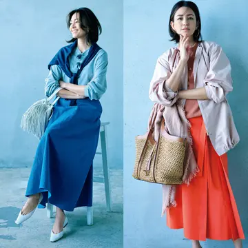 ワンピース¥50,600/アマン(フィナモレ) タンクトップ¥10,450/スリードッツ青山店(スリードッツ) パンツ¥36,300/ロンハーマン ストール(ベージュ)¥24,200・(ブラウン)¥24,200/アパルトモン 青山店(スロウ) バッグ¥361,900/トッズ・ジャパン(トッズ) 靴¥115,500/ドゥロワー 日本橋店(マノロ ブラニク)