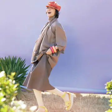 エルメスのジュエリー部門から、目新しいパールづかいが特徴的な「エルメス・シャンドラ」が登場。カシミヤシルクのカレジェアンとともに、富岡佳子さんが自由なムードでつけこなした。
