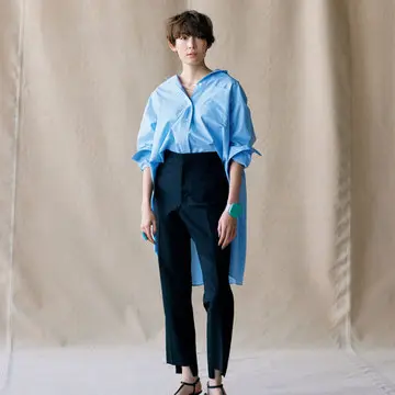 下半身の肉感を拾わない、しなやかで美しいドレープとほどよい張り感が特徴の定番パンツ。ヒップや太ももまわりはゆったりと、すそにかけてしっかりテーパードさせることで、ダークカラーでも全体が重く見えないよう工夫されている。