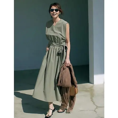 カーキグレーの他、ブラックも。肩~ウエストの直線的なラインが、二の腕を内側から細く。リボンはサイドでラフに結べばしゃれ見え。