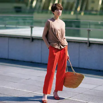 パンツ¥29,700/インターリブ(サクラ) トップス¥23,100/ギャルリー・ヴィー 丸の内店(ギャルリー・ヴィー) ピアス¥13,200・ネックレス¥9,900/エレメントルールカスタマーサービス(パティエラ) バングル¥8,800(レフィエ)・靴¥20,900(ラオコンテ)/以上フラッパーズ バッグ¥93,500/J&M デヴィッドソン 青山店(J&M デヴィッドソン)