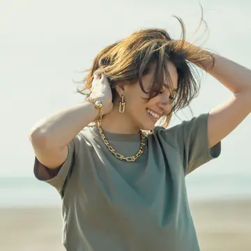 Tシャツを通年愛用しているというスタイリストの村山佳世子さんが、シンプルだけど素敵なTシャツの着こなしを伝授。控えめなパフスリーブで旬度の高いTシャツは、ロングスカートとワントーンにまとめて上品に。