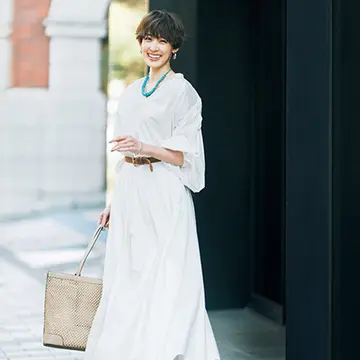 ドライな感触のリブニットはワンピースではボディラインが気になるけれど、セットアップなら体型カバーをしつつ、おしゃれ度は増し増しに。フレンチスリーブは夏まで活躍。
