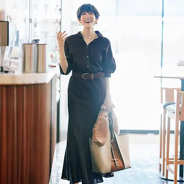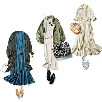 渋い配色のプリントは小物しだいでシーンレスに頼れる存在