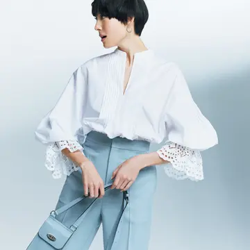 撮影/渡辺謙太郎 ヘア/左右田実樹 メイク/小森由貴 スタイリスト/福田亜矢子 モデル/RINA 取材・原文/坪田あさみ 取材協力/バックグラウンズファクトリー ※エクラ2022年6月号掲載