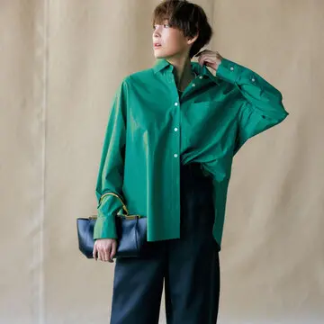 「ハイウエストの脚長効果を生かしつつ、気になるおなかのぽっこり感を目立たなくさせるには、トップスとの合わせ技で対応。おすすめは、横幅があり着丈も長めのシルエットで、空気をはらむようにふんわり着られるブラウスやシャツ。フロントのみをインにして、あとは自然と体に覆いかぶさるように着ればスタイルアップがかないます」(スタイリスト・福田亜矢子さん)