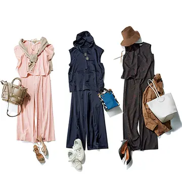 今シーズン、種類豊富で人気なのが、ジレやジャケットとボトムのセット。Tシャツとボトムだけではなんとなく頼りない。そんなときにイメージ一新の威力を発揮。白いTシャツが今どきに変わる。
