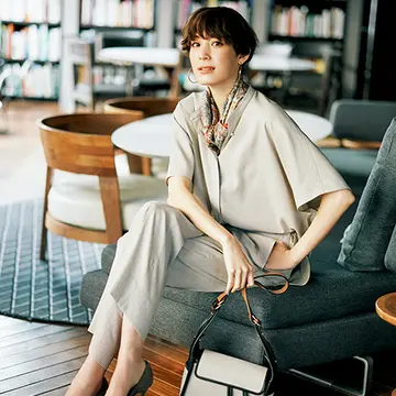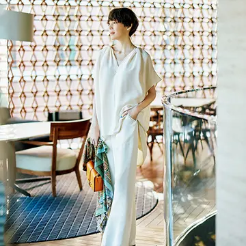涼しげなリネンのセット。テーラードのジレは両サイドに長いスリット入り。歩くたびにジレのすそもパンツも揺れて、こなれた風情をアピール。テクニックいらずで、雰囲気のある人になれる。