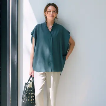 肘にかけて細くなる五分袖で、二の腕をすっと細く見せてくれる一枚。ビッグシルエットではないので、上半身が適度にコンパクトになり、ゆったりとしたワイドパンツやマキシスカートなどボリュームボトムと合わせると脚長効果も得られる。