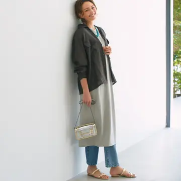胸もとのあいたトップスやワンピースの登場回数が多くなる夏はバストの下垂とともに起こるデコルテの“削げ感”が気になるもの。透け感のあるシャツにロングネックレスをアクセントに使えば、デコルテを華やかに見せてくれる効果が。