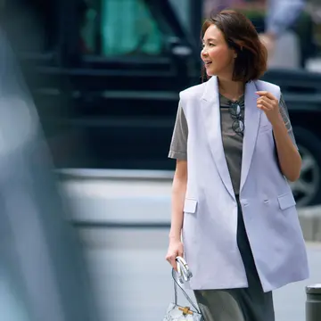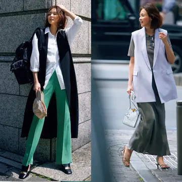 コーディネートだけでは体型カバーがしづらい薄着の季節は、デザインや素材、ディテールにこだわったアイテム選びが重要に。ボディの厚みが気になる人には、ダークカラーのショート丈ジレがおすすめ。上半身がすっきり引き締まる!