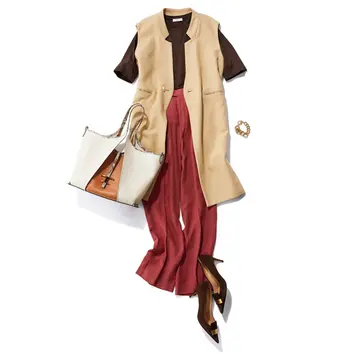 ジレ¥27,940・パンツ¥24,970/アンクレイヴ(アンクレイヴ ホワイト) カーディガン¥29,700/ギャルリー・ヴィー 丸の内店(ギャルリー・ヴィー) カットソー¥13,200/アマン(アンスクリア) ネックレス¥26,400・ブレスレット¥26,400/ザ ストア バイシー 代官山店(ローラ ロンバルディ) バッグ¥165,000/J&M デヴィッドソン 青山店(J&M デヴィッドソン) 靴¥93,500/ピエール アルディ 東京(ピエール アルディ)