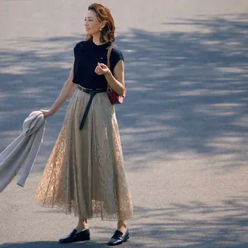 すそにかけてたっぷりボリュームを出したフレアスカートに、太幅のウエストベルトをぎゅっと締めてはくラップスカート。シルエットは甘めながら、ピンストライプが縦ラインを強調し、ハンサムなトラッドさも感じさせてくれる。太幅のウエストベルトが肉感を抑えてくれるから、トップスインにしてもぽっこりしづらい。