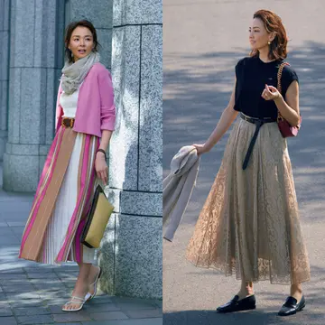 フレアスカートは、気になるおなかまわりをさりげなくカバーしてくれるアイテム。ウエストまわりにポイントをおいた「ワザあり」なデザインを選べば、効果的に着やせがねらえる!