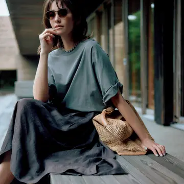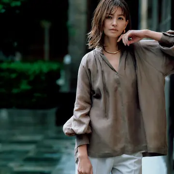 大人を素敵に見せる夏のニュアンスカラー=洗練アースカラー。あいまいさがあって、ニュアンスが出しやすいから、夏こそ一番映える色。相性のいいアイボリーとアーシーブラウンのコーデをスタイリストの村山佳世子さんが提案。