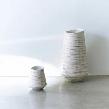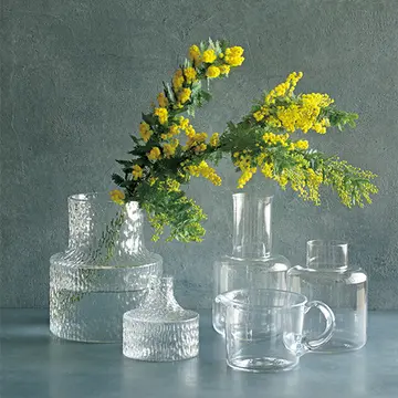 扇形と長方形の2種類があり、連結できるフラワーベース。テーブルセンターや窓辺など、置きたい場所に合わせて自由に組み合わせられ、美しいカットのきらめきをいろいろに楽しめそう。カット部分にかかるので植物を生けやすいと聞き、ますます欲しくなりました。(副編S林)