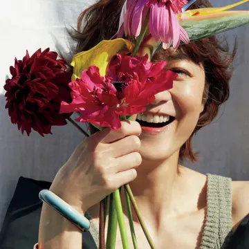 サングラス¥45,100/ケリング アイウエア ジャパン カスタマーサービス(ボッテガ・ヴェネタ) オールインワン¥176,000・ブラウス¥154,000/ブラミンク ピアス¥62,700・リング(右手)¥89,100・(左手)¥81,400/ボッテガ・ヴェネタ ジャパン(ボッテガ・ヴェネタ)