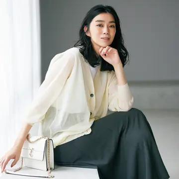カーディガン¥20,900・トップス¥8,800/ミューズ ドゥ ドゥーズィエム クラス 六本木店(ドゥーズィエム クラス) スカート¥30,800/ザ ストア バイシー 代官山店(コキュカ) ネックレス¥70,400/エスケーパーズオンライン(ハルポ) バングル¥20,900/アマン(アンセム フォー ザ センセズ) バッグ¥37,400/ヴェルメイユ パー イエナ 青山店(メゾン エヌアッシュ) ★靴¥38,500/エクラプレミアム通販(徳原文子×イル サンダロ オブ カプリ)