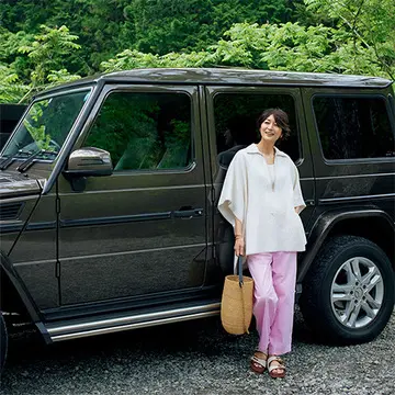 鮮やかなブルーが旅の高揚感をより高めてくれるラフィアのバッグは、軽量かつ柔らかなシルエット。荷物もたっぷり入るから旅のお供に最適。その他の小物は色を抑えて、メリハリを効かせて。自然に身を置くグランピングでは、夏でもブランケットがわりになるカシミヤのストールが必須。落ち着いたダークグレーの一枚なら、屋外でのくつろぎのひと時も絵になる。