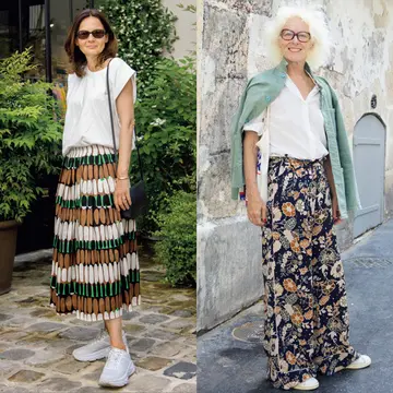 甘くなりがちなフェミニンな花柄スカートをキリッと着こなすヴェロニクさん。クリーンなザラのシャツは、袖をほどよく折って、ウエストをキュッと結んでポイントにし、全体のバランスを上手にとって。ストラップ長めのバッグのゆるさかげんもちょうどいい。