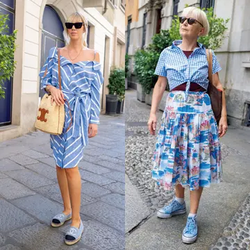 今すぐバカンスへ旅立ちたいと思わせる陽気の中、街を歩くマダムたちの服装もどことなくリゾートテイスト漂うもの多し。おしゃれ都市ミラノから、澄みきった空のような青で夏の開放感を味わうマダムたちのスナップをお届け!
