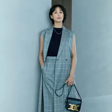 パンツ¥31,900(アパルトモン)・バッグ¥31,900(アポワン)/以上アパルトモン 青山店 ニット¥23,100・カーディガン¥34,100/スローン サングラス¥39,600/モスコット トウキョウ(モスコット) ネックレス¥132,000/バーニーズ ニューヨーク カスタマーセンター(マルコム ベッツ) 靴¥46,200/ザ・グランドインク(ロランス)