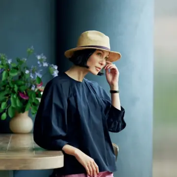 夏に快適なTシャツワンピースをタウン仕様にするなら、顔まわりに優雅な立体感を添える中折れハットを合わせるのが近道。濃色の帽子は髪にもなじみ、取り入れやすさも抜群。