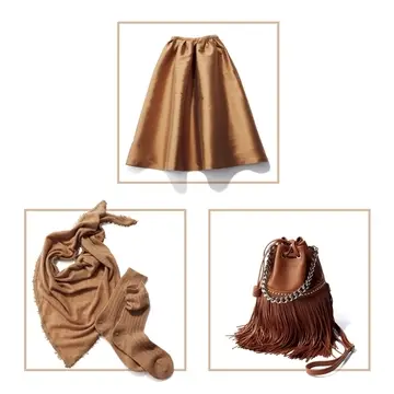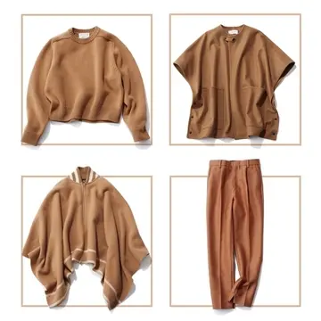 「いつも黒などの濃い色のアウターを選ぶことが多かったのですが、面積の大きいベージュで気分転換してみたくなり展示会でオーダーしたポンチョ。カシミヤをたっぷりと贅沢に使っているのに、長めのフリンジやベロアのトリミングで少しカジュアル見えするのもポイント。ボートネック風にして着るとすそのラインが変わるので、違った表情も楽しめます」(編集SH)。
