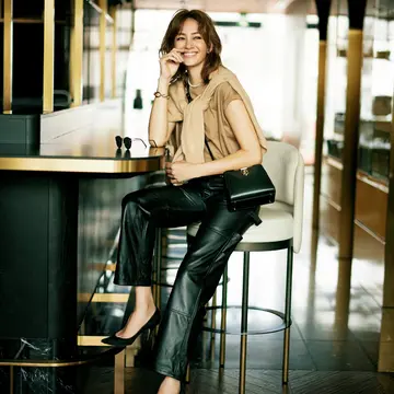 ニット¥97,900/ドゥロワー 二子玉川店(ドゥロワー) パンツ¥71,500/マディソンブルー メガネ¥33,000/アイヴァン 東京ギャラリー(アイヴァン) ピアス¥23,100・ネックレス¥18,700/八木通商(ローラ ロンバルディ) バングル¥16,500/アマン(アンセム フォー ザ センセズ) バッグ¥176,000/J&M デヴィッドソン 青山店(J&M デヴィッドソン)
