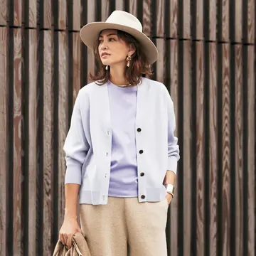 ドラマティックなピンクのフレアスカートが目立ちすぎることなく、大人っぽくはきこなせるのは、ピンクとコントラストがつきすぎないサンドベージュの色みで、全体がすっきりとまとまって見えるから。ニットがホワイトではなくニュアンスのあるサンドベージュというのが今らしさのポイント。リラクシーなニットのざっくり感もいい。