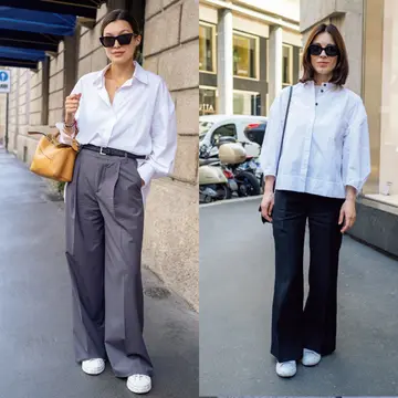 ウエスト位置がやや高めで、タックとセンターライン入りのワイドパンツはこの秋の本命。ワードローブの常備品にぜひおすすめです。タックがあることで、気になるおなかまわりや太ももはスマートにカバーされ、またセンターラインのもたらす脚線美とスタイルアップ効果で、下半身を美しくラッピングしてくれます。きゅっとコンパクトなトップスとの相性も抜群で、全身のバランスも去年とは様変わりする、と大人にいいことづくし。モダンなのにむずかしくないって、おしゃれする喜びが増えるようでうれしいですよね。素材や色など挑戦しながら、大人こそ堂々と着こなしてほしいです。(スタイリスト・福田亜矢子)